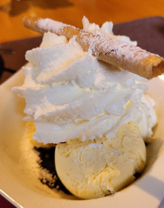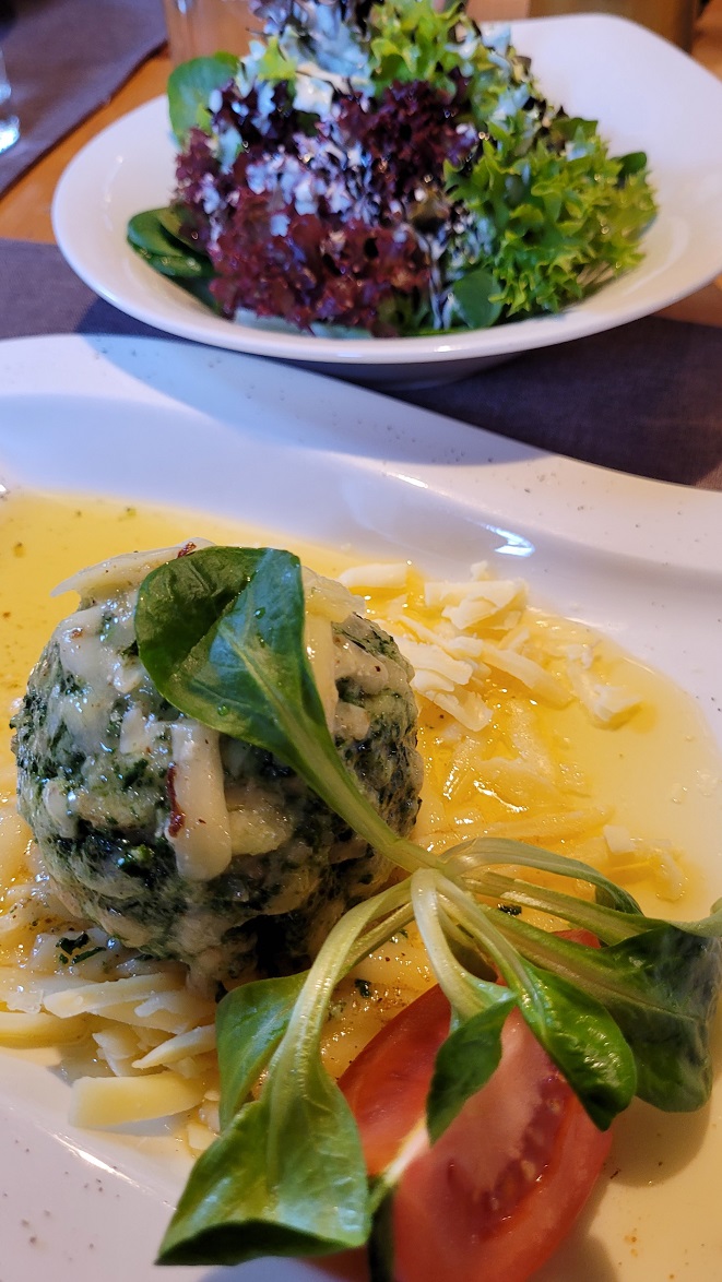 Ensimmäinen haarukallinen perusteli sen, kuinka naapurimaan ruokalistalla pärjää Sveitsissä. Ruoka oli herkullista ja esillepanoonkin oli selvästi panostettu. Otin pienemmän annoksen ja kaduin, sillä sitä sain mitä pyysin. Kalliin, pienen nyrkin kokoisen pinaattinködelin ja nälän pari tuntia syömisen jälkeen. Yritin tasapainottaa tilannetta jätskiannoksella, huonolla menestyksellä. Lämmin suklaakastike oli ihanaa, muttei pitänyt nälkää loitolla sekään.