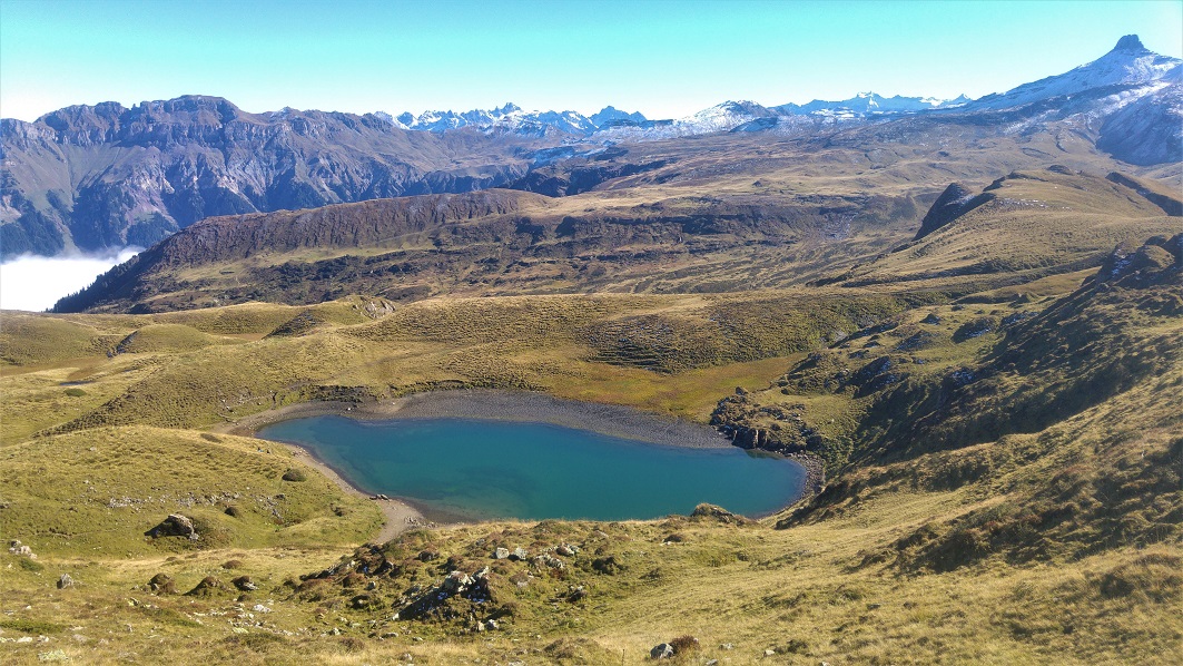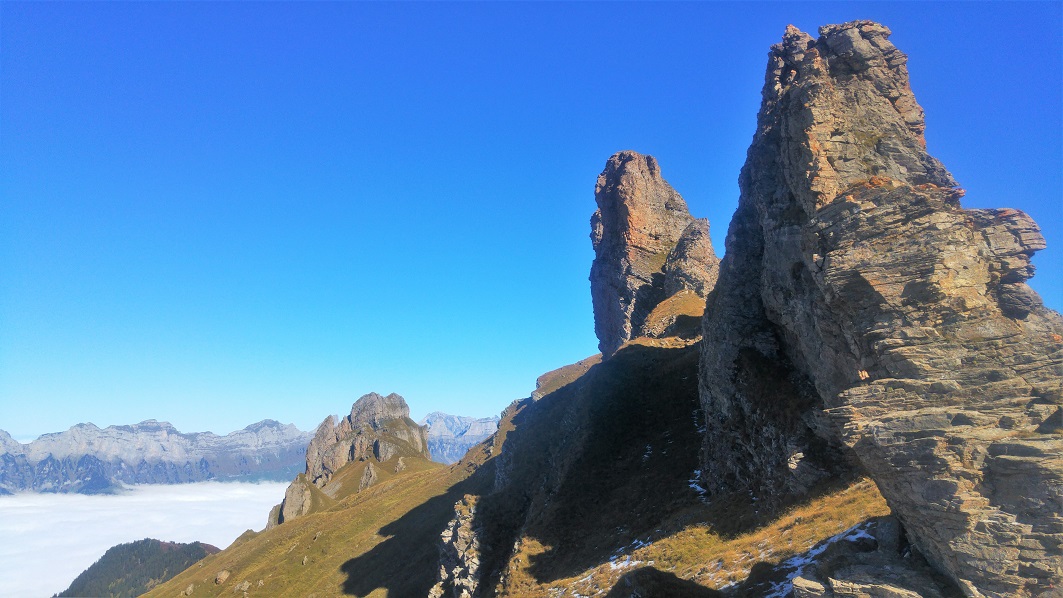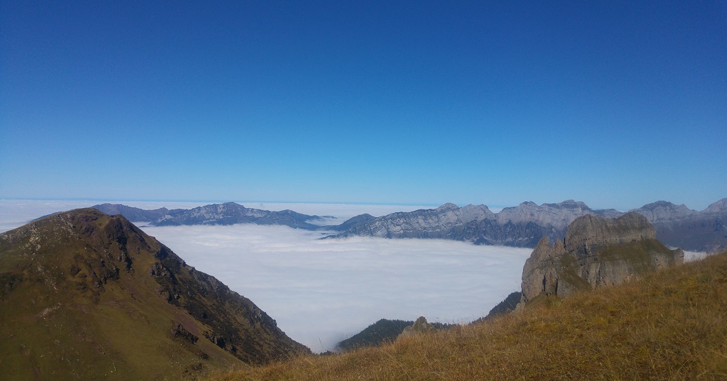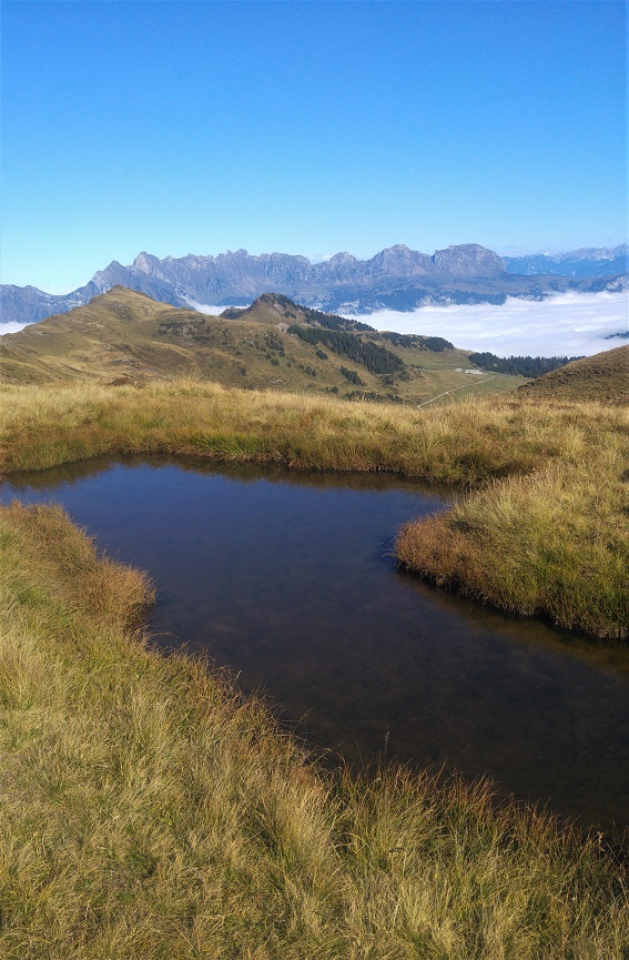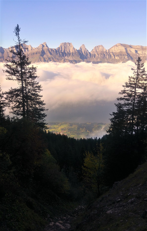 Calnègian kivitalot olivat samaa sarjaa kuin aiemmatkin matkalle osuneet, pieniä, pinnalta eläväisiä ja toisiinsa tukeutuvia. Paikassa vallitsi syyspäivänä rauha. Kesällä niityille tuodaan lehmiä laiduntamaan. Kapeassa laaksossa ollaan todellakin kuin herrankukkarossa. Istahdimme kivelle syömään leipiä ja tuijottelemaan käsittämättömän keltaista maisemaa. Sveitsissä ei kovin maailman ääreen pääse, mutta täällä tuntui siltä. Olimme toisessa aikakaudessa, siellä missä luonto määrää elämää, perinteet pitävät hengissä.
