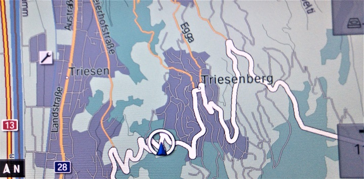 Pienet eväät vetäistiin lämpimässä rinteessä. Olihan tässä jo tallattu, peräti 1,78 km. Jäällä jännittäminen oli kuitenkin tyhjentänyt energiavarastot. Tai sitten oli muuten vain nälkä. Onneksi paussi tuli pidettyä, sillä tietämättämme olimme jo lähellä sivilisaatiota eli reitin päätymistä tympeälle teollisuusalueelle. Oranssit patikkapolkukyltit kuitenkin kehottivat jatkamaan kohti Bergrestaurant Rosinlia. Siellä pitäisi olla hyvät näkymät, olin lukenut. Joten töppöstä toisen eteen.