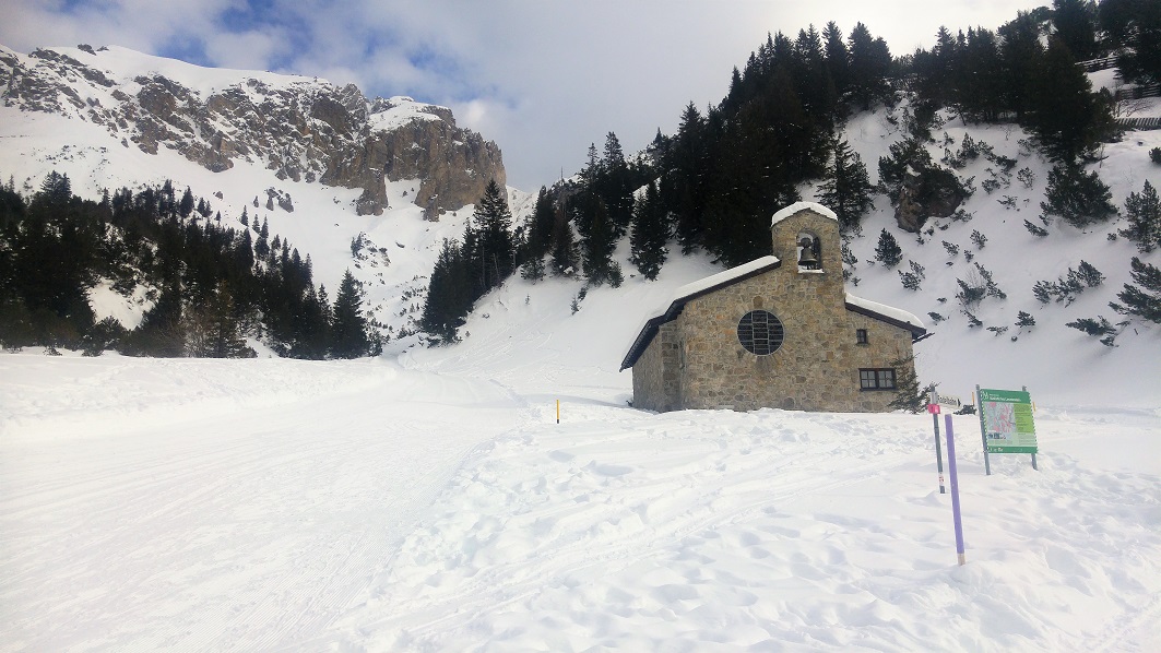 Ylhällä laaksomaisessa Malbunissa on talvella patikkareittejä tasan yksi, joka lähtee rauhankappelilta. Kappelilta, jota ei ole merkitty mihinkään karttaan ainakaan netissä. Paikanpäällä tajusin, ettei yhden tien kylässä ole kovin paljon mahdollisuuksia. Joko se on tien oikealla tai vasemmalla puolella.