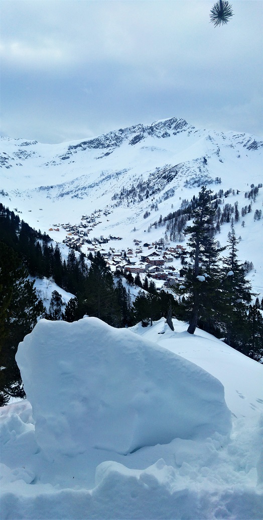 Lähdimme tallaamaan aurinkoa kohti, kuten muutkin jalan kulkevat, koirat ja ihmiset. Tuuli pöllytti lunta ja epäilin Sveitsin puuskien sittenkin yltävän tänne korkeaan laaksoon. Aurinko valaisi liikaa, en saanut tolkkua puhelimen ohjeista tai suunnasta. Näkymän olisi pitänyt olla Pizoliin päin, sveitsiläisille vuorille. Itävalta kuitenkin kajasti; epäilin jo kuulevani wienervalsseja.