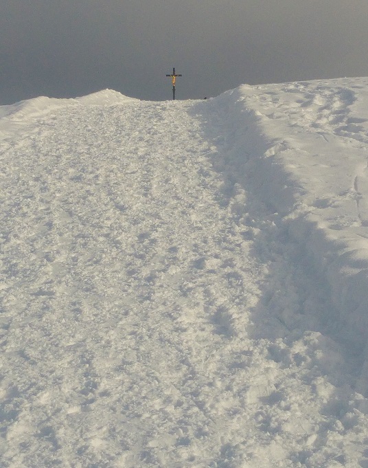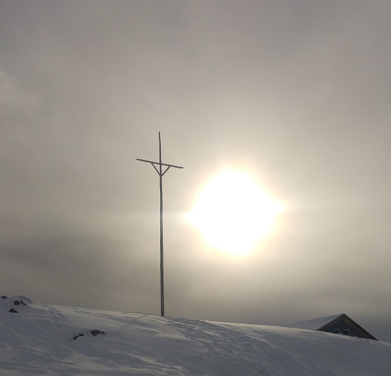 Mäkeä riittää aina kultaisen Jeesukseen asti. Ristillä on näköalapaikka, josta tosin on juuri nyt aika hintsusti näkymää. Pyörähdämme ympäri ja palaamme hiukan takasin päin, talvilevolla olevan alppitilan luo, kuten kaikki muutkin.