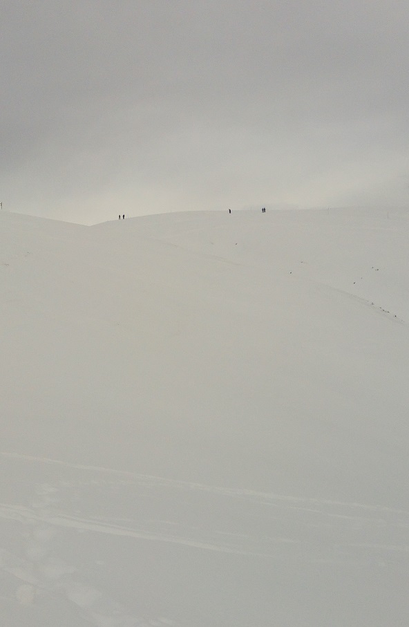 Ja läähätän, tietenkin, koska tamppaamme mäkeä ylös. Se, että pulssi on tapissa ja hiki valuu talvitamineiden alla, ei vähennä euforista tilaa, pikemminkin lisää sitä.